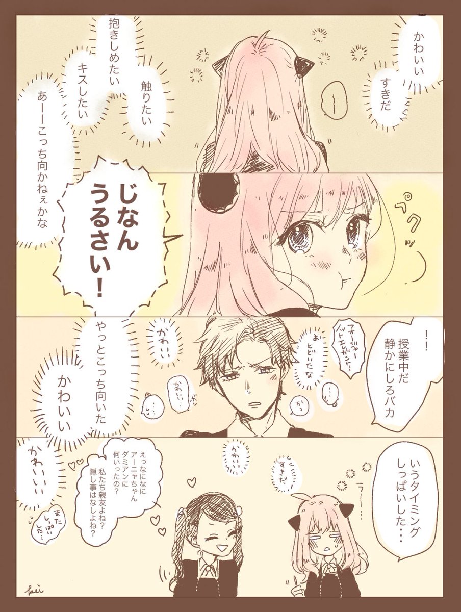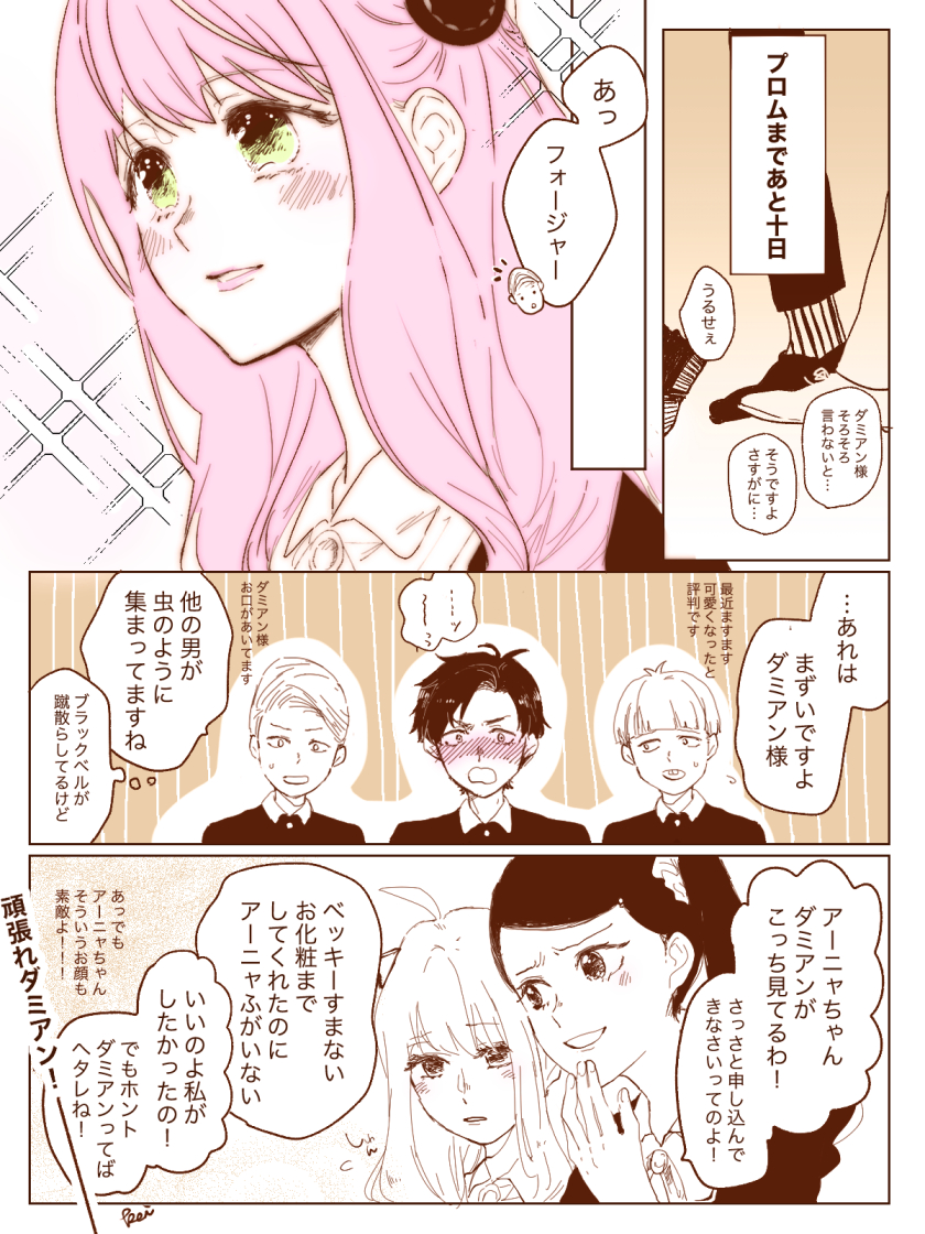 ベッキーの入れ知恵により色仕掛けがんばるアニャ。滝汗のダミアン。 ベ「いいわよ!いいわよ!アーニャちゃんエレガントよおお!!!」 へ「ノットエレガントオオオオオオオオ!」 #ダミアニャ成長if #ダミアニャ