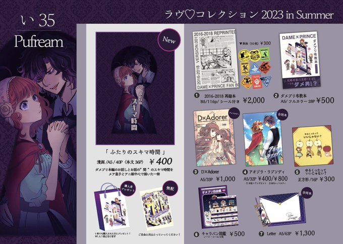 【7/16(日) ラヴコレ2023 】 #ラヴコレ2023夏お品書き スペース:【い35】 サークル名:【Pufream】 ダメプリのメア皇子×アニ姫中心の新刊頒布予定です〜!!無配のポストカードなどもありますのでぜひお立ち寄りください〜! ▼新刊サンプルはこちらのリプに繋げます