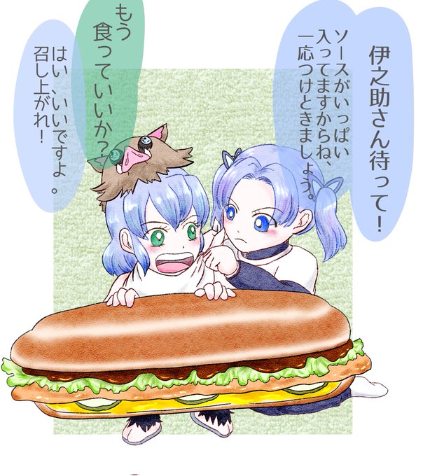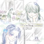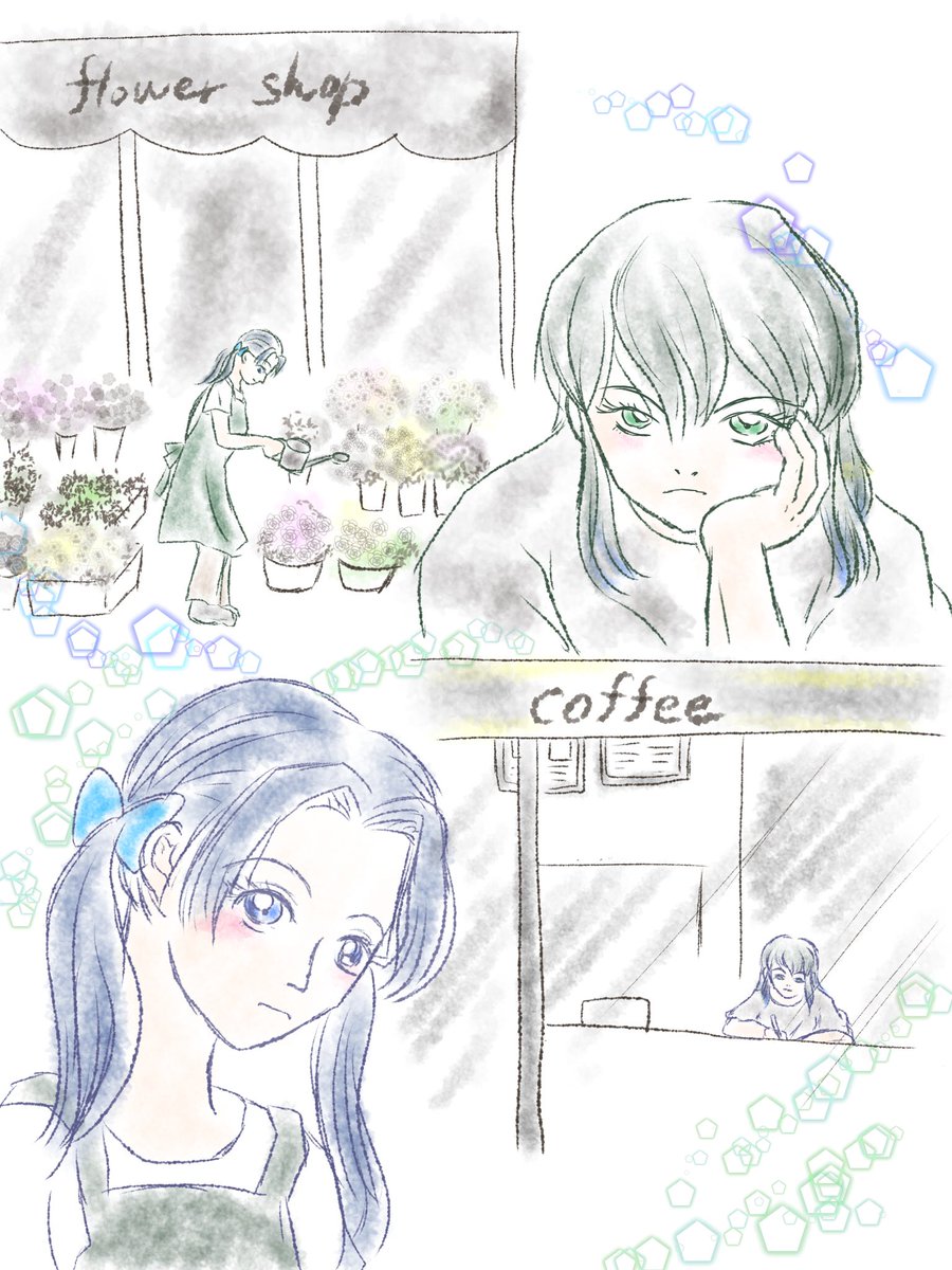 #伊アオ版深夜のお絵描き60分一本勝負 開催ありがとうございます。 お題:「カフェ」「視線」 時間:80分 🌸屋でバイトする🦋ちゃんとド◯ールっぽいお店(カフェでいいよね?)にいる🐗。 相変わらずラフに色塗り💦