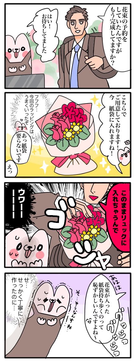 【花屋さんからお客様へお願い】 花束をリュックに無理矢理詰めこむのはやめてください…🥀 #漫画が読めるハッシュタグ #エッセイ漫画 #4コマ #絵日記