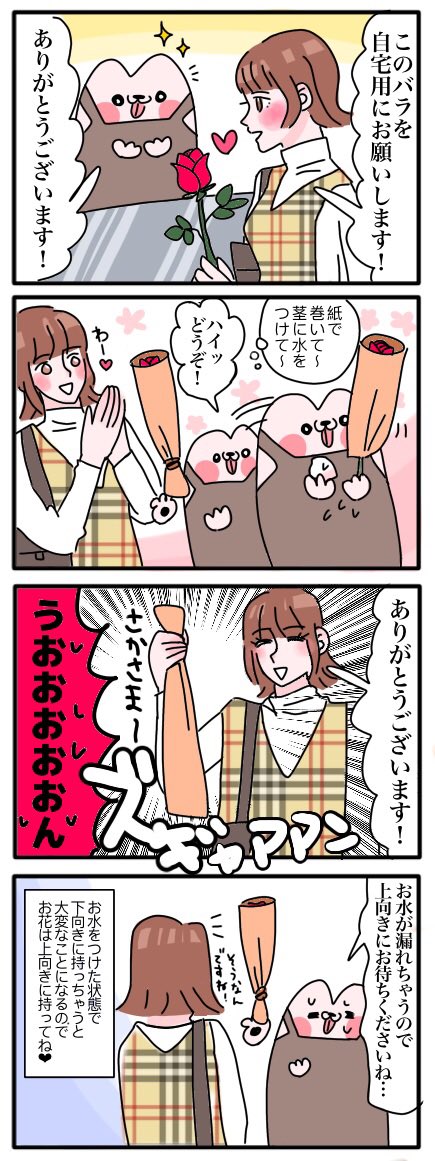 【花屋あるある】 水がついたお花は上向きに持ってね!💐 #漫画が読めるハッシュタグ #エッセイ漫画 #4コマ #絵日記