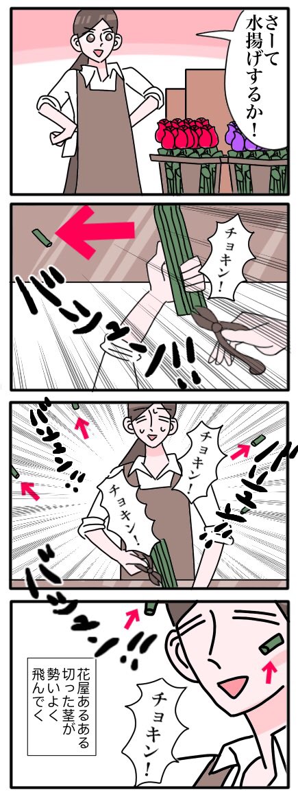 【花屋あるある】 切った茎が勢いよく飛んでいく🌿 #漫画が読めるハッシュタグ #エッセイ漫画 #体験談