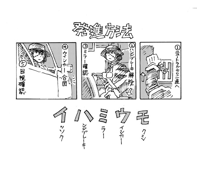 MT発進時の順序を覚える用です。 足はクラッチ、ブレーキ踏んだ状態 手順後アクセル踏み半クラ発進へ
