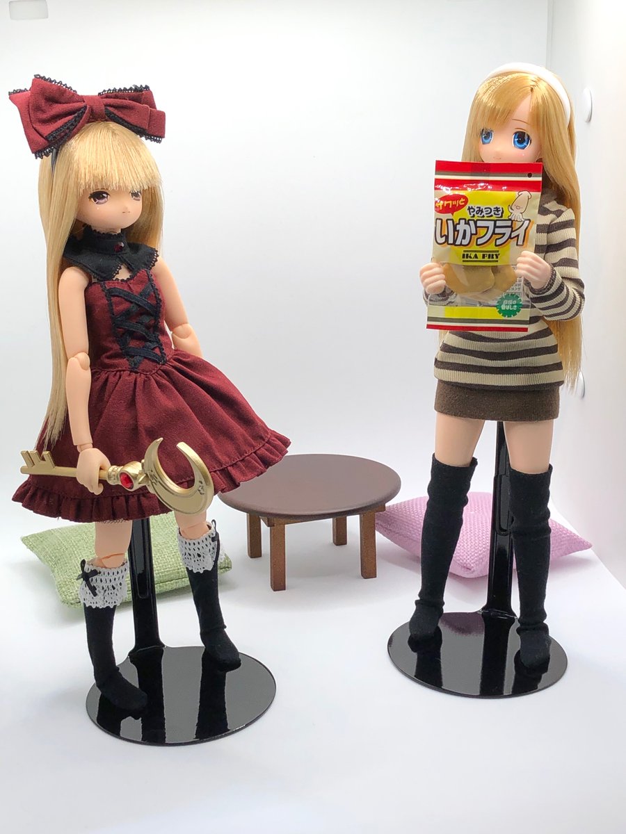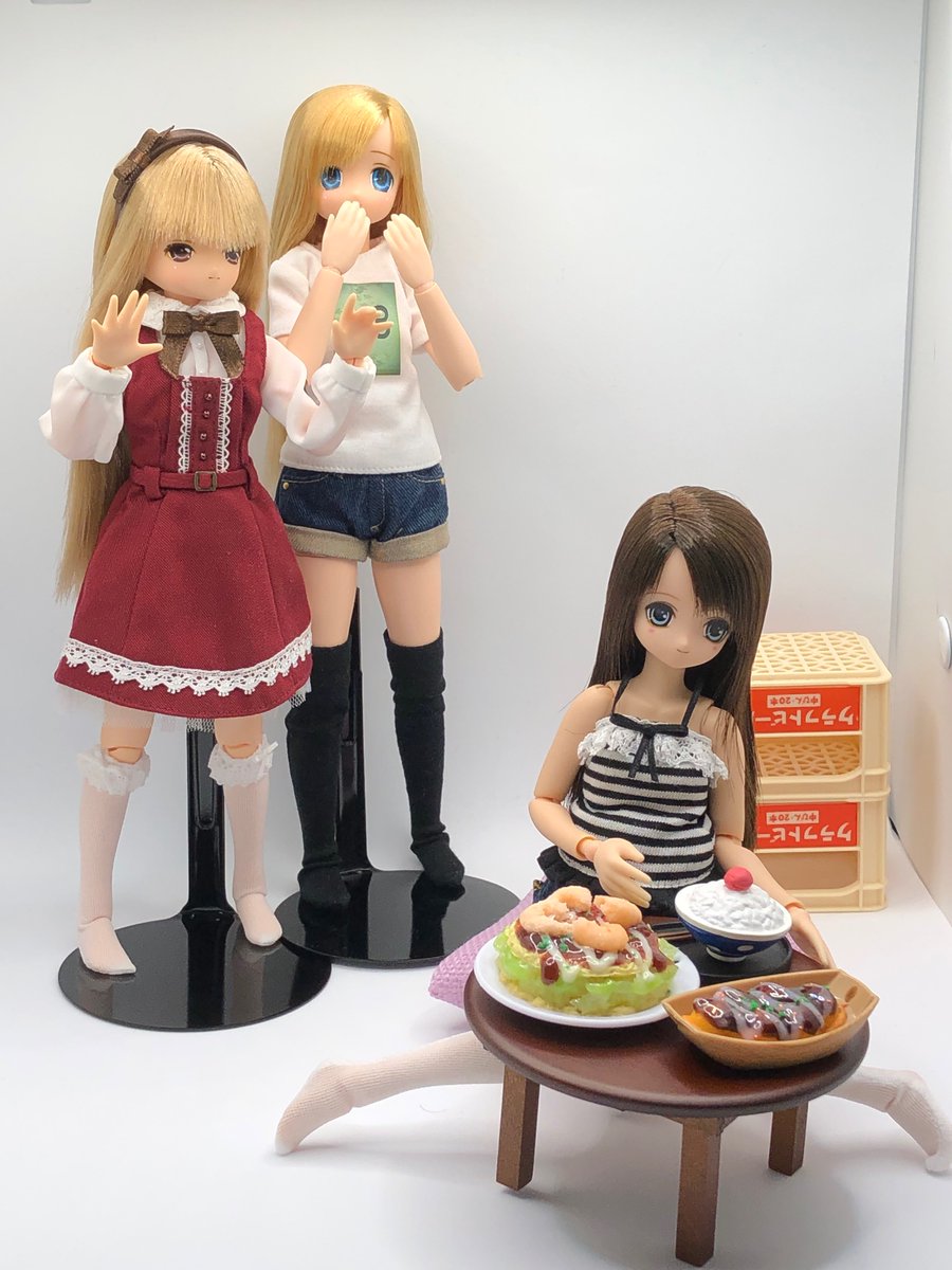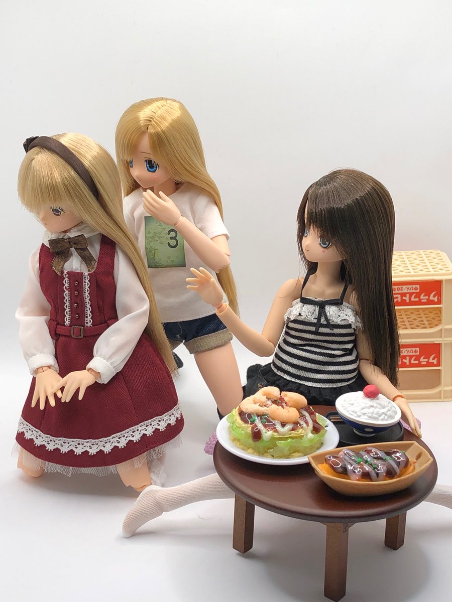 #今夜のドール撮影120分一本勝負 1月4日お題【とる】 ひめの 「タコ焼き美味しかったから撮らないと」 リアン 「美味しいものを撮るってさすがひめのん女子力高い!」 ひめの 「ところで女子力ってなんやろう?」 リアン 「なんだろう...?」 #アゾカツ #アゾン #えっくすきゅーと