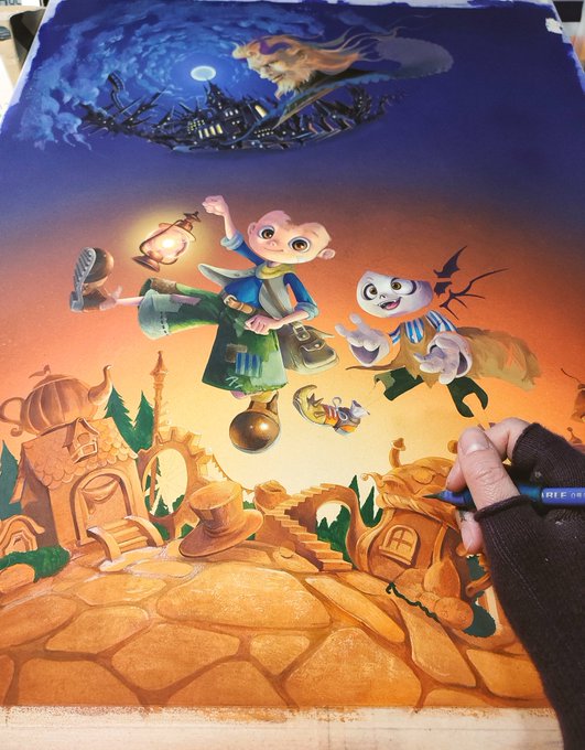 全てのイラストはアクリルガッシュによるアナログ手描きです。 特にメインビジュアルは木炭紙大サイズに画用紙水張りと大きく、ベースに背景のグラデーションを塗った上に描き込んでいったので失敗が許されない制作過程でした🎨🖌️ #劇団四季 #ジャック・オー・ランド 🎃 #ニッセイ名作シリーズ