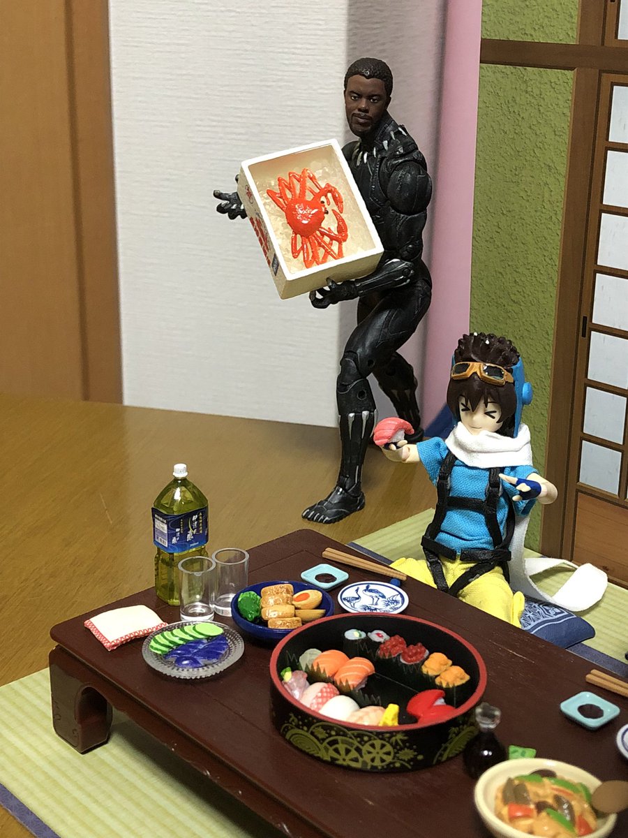 嫁ちゃんの寿司撮影に蟹届けつつ便乗するワカンダ国王。 #オモ写