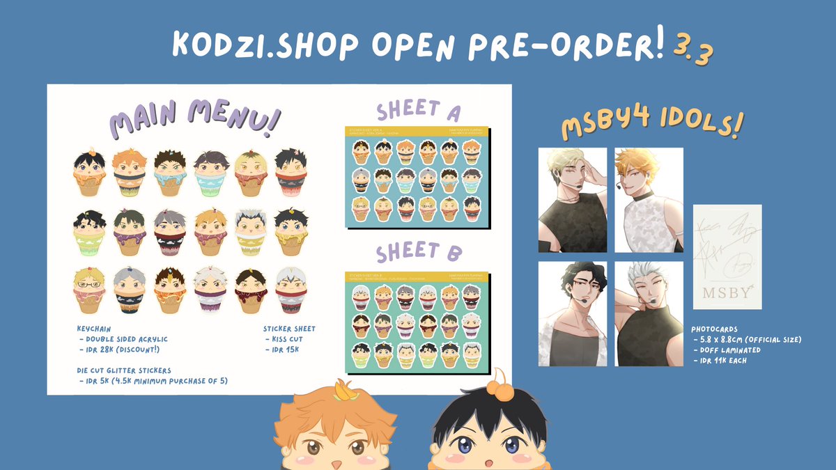 ⭐ OPEN PRE ORDER! 3.3 — fanmerch by kodzi.shop katalog ☆ : • acrylic keychain • glitter stickers • sticker sheet • photocard 🗓 3 maret - 7 maret 🚚 1 - 2 minggu 💳 shopee (rts and shares appreciated ♡) #haikyuu #haikyuufanart