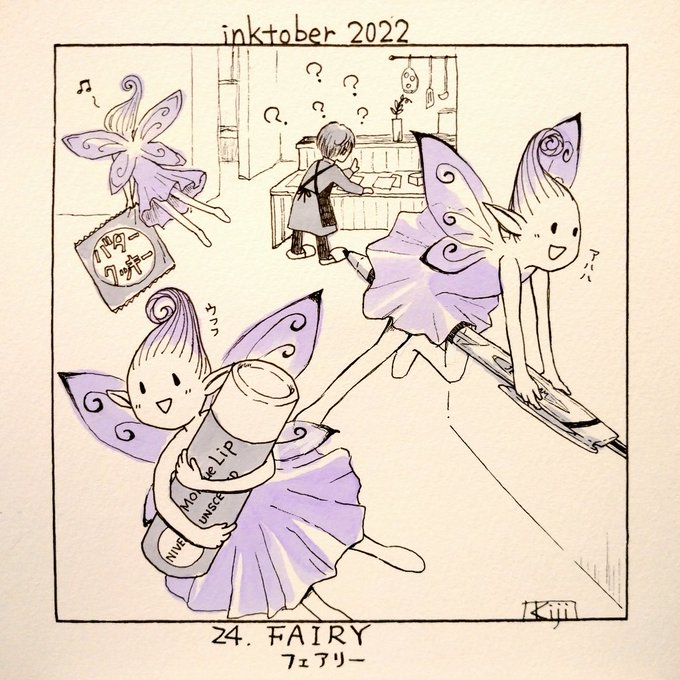 #inktober #inktober2022 #inktober2022day24 #インクトーバー #妖精 ちょっとした物が、すぐ行方不明になっては妙なところから発見されるので、うちは2~3フェアリーほど棲んでるんだと思う。