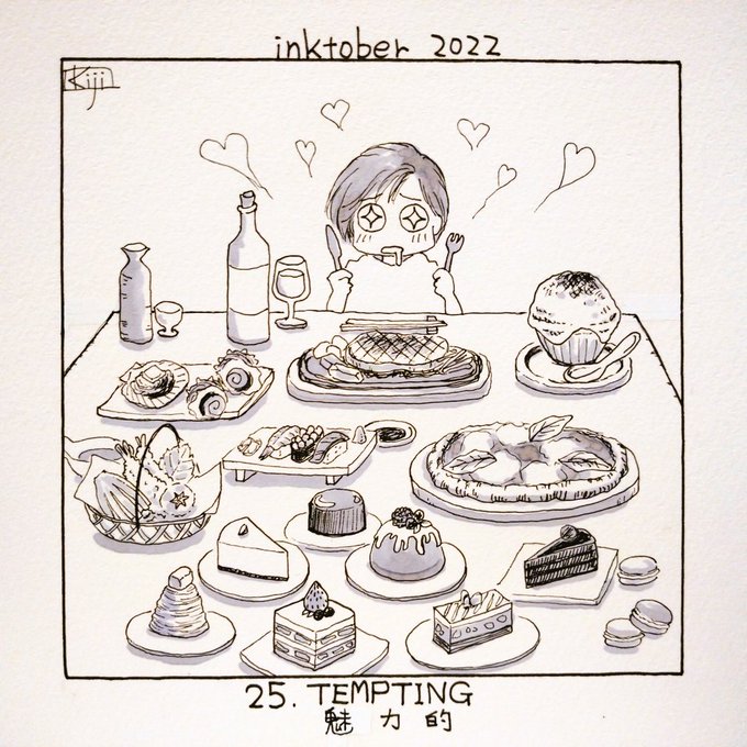 #inktober #inktober2022 #inktober2022day25 #インクトーバー #魅力的 美味しい日本酒、白ワイン、ホタテのバター醤油焼き、サザエのつぼ焼き、天ぷら、お寿司、牛ステーキ、シチューのパイ包み、マルゲリータピザ、ケーキ各種食べ放題…、 入りきらなかったけど秋刀魚の塩焼き(大根おろし多め)。