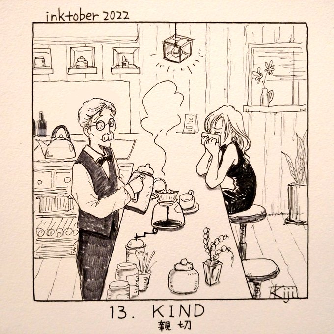 #inktober #inktober2022 #inktober2022day13 #kind #うちのマスター 何も言わない。何も聞かない。 けど黙ってそばにいて、おいしいコーヒーくれるひと。