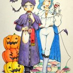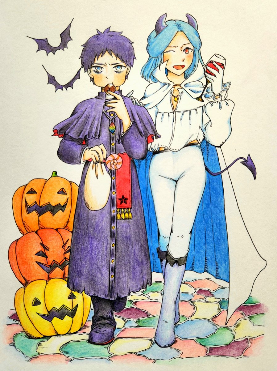 #共通テーマお絵描き 【ハロウィン】 こちら参加させていただきます🎃👻🍭 双子の精霊(契霊)こと、レイルアーとスイセアーに衣装を着てもらいました🦇🍷 目を離すと喧嘩を始めるのでご注意を💀 twitter.com/fal_reto/statu…