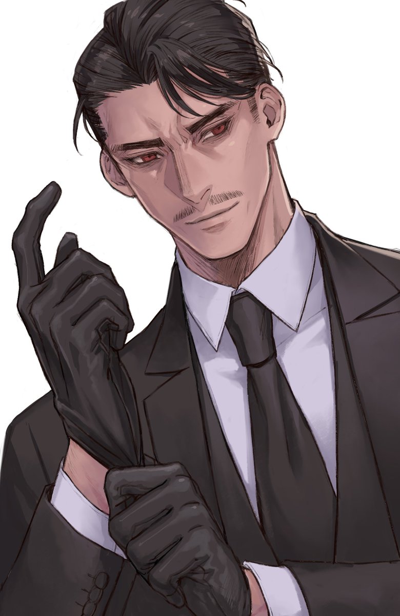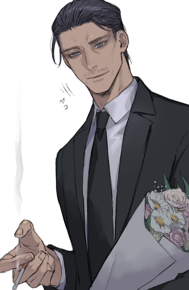 毎週末朝近所の墓地を通りかかると見かける、仏花を持ってお参りに来たスーツ姿の寂しい目のおじさん(未亡人) 「やぁお嬢さん。今朝は早いのだね」 #私のことをお嬢さんと呼ぶ近所のタバコ吸ってるイケおじキャラデザ大会
