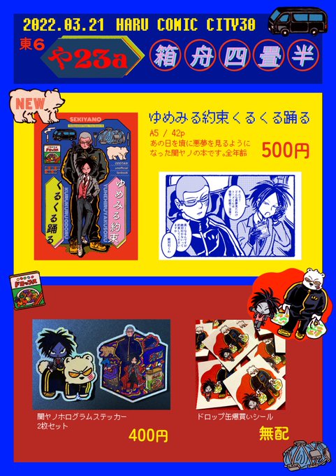13 41 3.21春コミおしながきです 関ヤノ新刊サンプルはリプ欄に 22/03/20 09:54