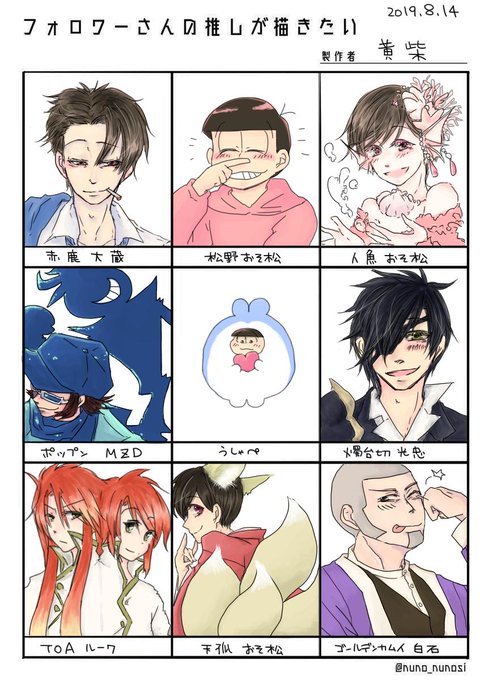 5 15 #フォロワーさんの推しが描きたい 完成~!!!!!ありがとうございました!楽しかったです!!ちなみに真ん中は枠があいたので私の押しのうしゃぺです 19/08/14 23:50