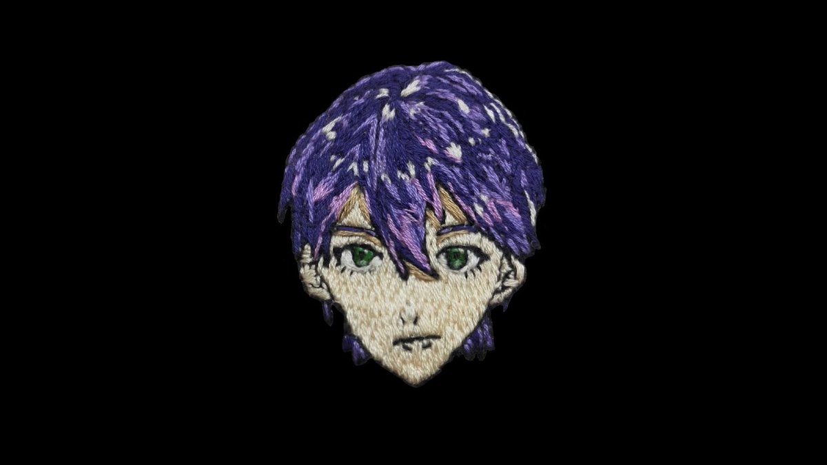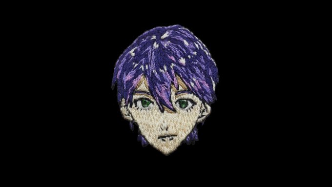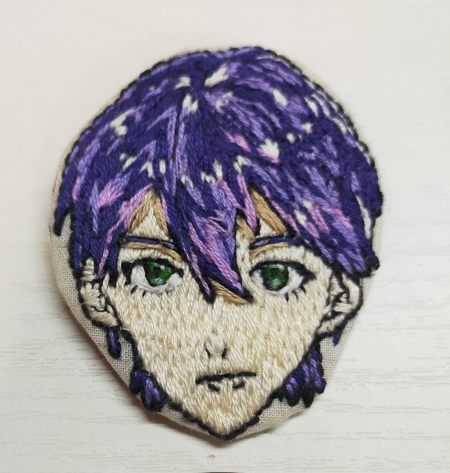 2 8 刺繍剣持刀也はブローチに仕立てました!裏側には虚空教のシンボルもあしらっています。画面一杯に広げた画像をみながら、目の緑は3色、髪は5色の刺繍糸を使ってできるだけ忠実になるように拘りました。思っていたより髪色が明るくて紺を増やし若干デフォルメも入れてます。#剣持刀也 #金剛力也像 22/04/11 17:42