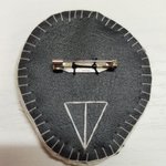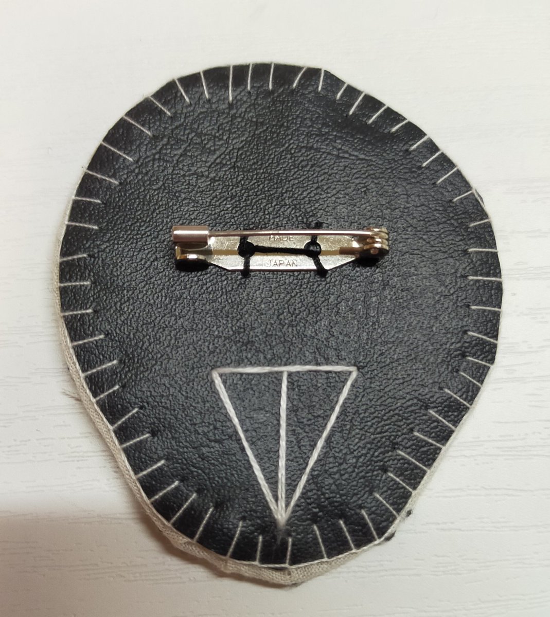 刺繍剣持刀也はブローチに仕立てました!裏側には虚空教のシンボルもあしらっています。画面一杯に広げた画像をみながら、目の緑は3色、髪は5色の刺繍糸を使ってできるだけ忠実になるように拘りました。思っていたより髪色が明るくて紺を増やし若干デフォルメも入れてます。#剣持刀也 #金剛力也像