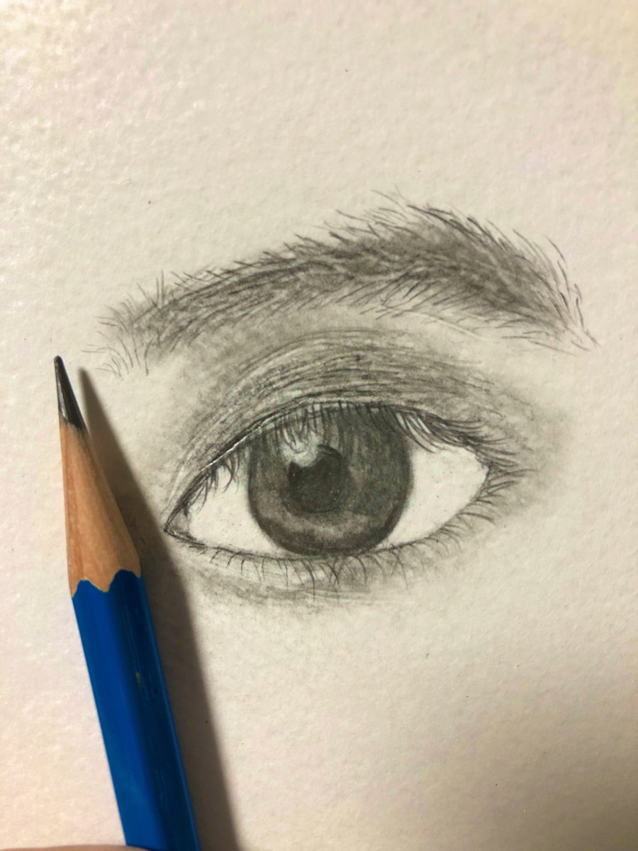 ネットで色々描き方見て目だけ描いてみた✍️ 人が描いてるの見てると簡単そう…とか思っちゃうんだけどいざやると難しいー!もっとリアルに描きたい! 目頭のところ水分ついちゃって失敗したので必殺鉛筆隠し🙈笑 #デッサン #絵描きさんと繫がりたい