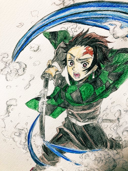 息子くんに頼まれて描いた炭次郎〜 しかも水彩色鉛筆あったのでそれで着色してみたけど、激ムズ、、 炭次郎てちょーー難しいのね、、😭 息子くんは大喜びだったけど✌︎ #鬼滅の刃 #絵描きさんとつながりたい