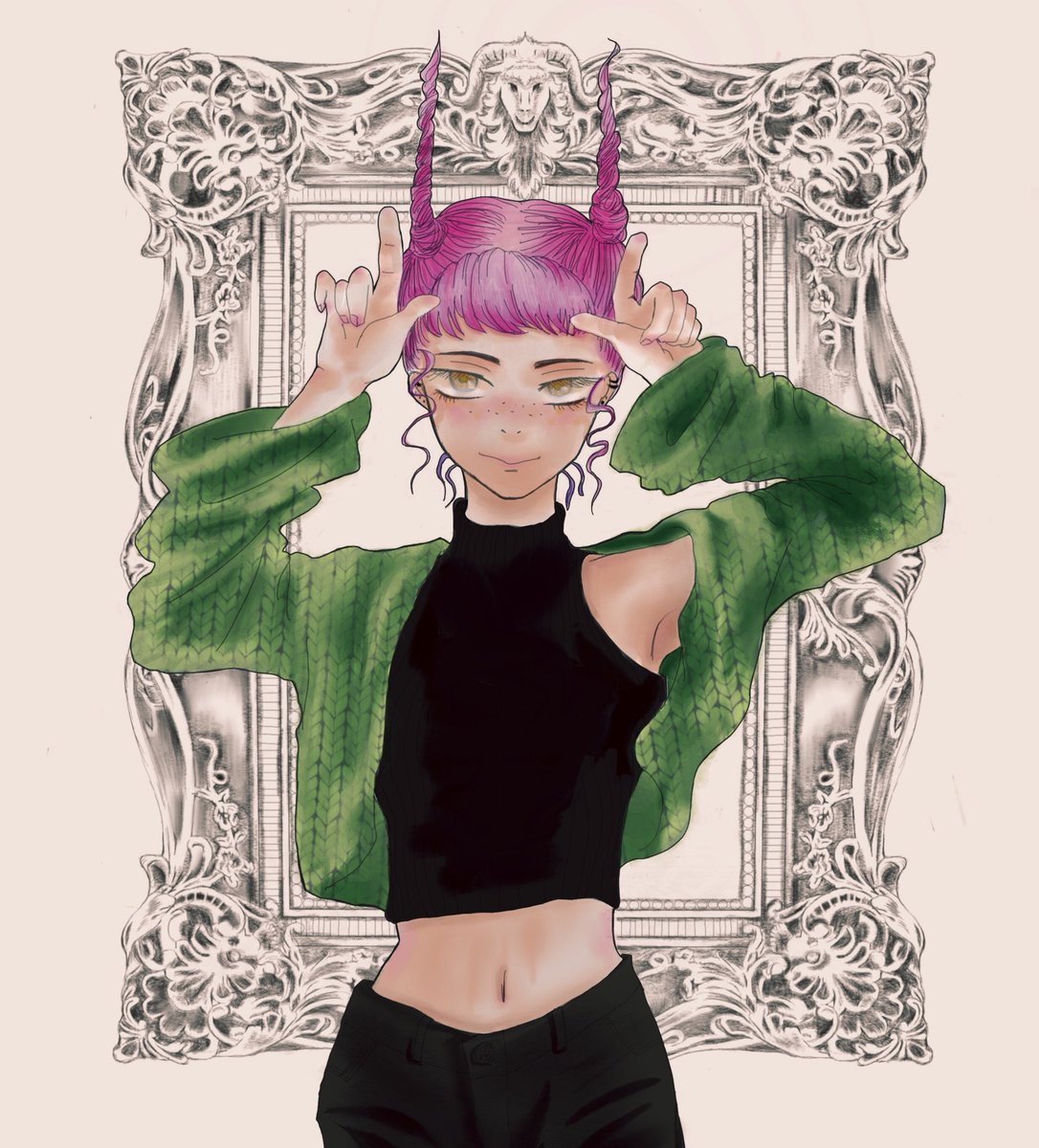 やっと完成した山羊座ちゃん🐐 背景に思ってたより時間がかかってしまった…実は額にも山羊がおります🐐ジョジョみたいな色合いになってもーた😂 #デジタルアート #星座イラスト #絵描きさんと繋がりたい #イラスト好きと繋がりたい