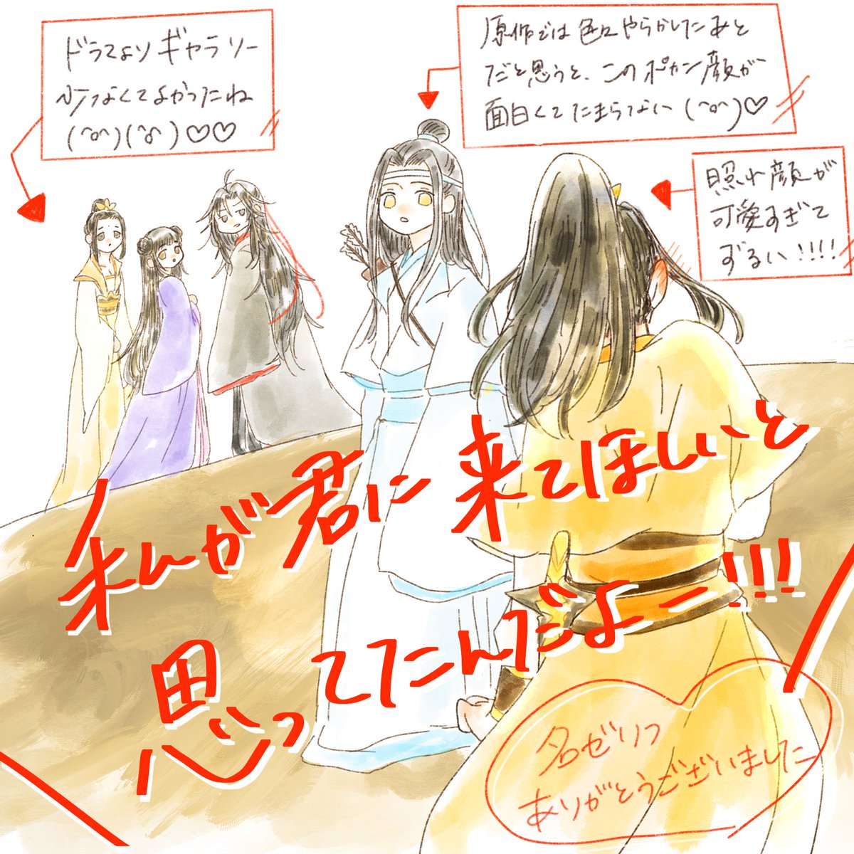 83 481 羨雲編4話ラスト 可愛すぎて描いてしまった 間にたくさん人がいるのに(一番近いのが藍湛なの面白すぎる)厭離しか見えてないのが可愛すぎたね🥺 21/05/17 14:02