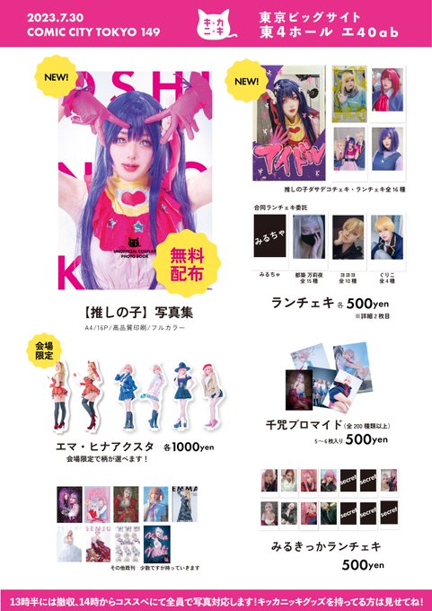 25 127 7月30日 COMIC CITY 東京149(東京ビッグサイト) 東4ホールエ40ab 🐈お品書き🐈 久しぶりに無料配布写真集があります!無料だけどA416Pあるし無駄にオフセットでクソ綺麗です(どうして!?) あとは会場限定で選べるアクスタや種類ありすぎて絶対かぶらん千咒ブロマイド、既刊など!チェキ詳細→ 23/07/26 20:03