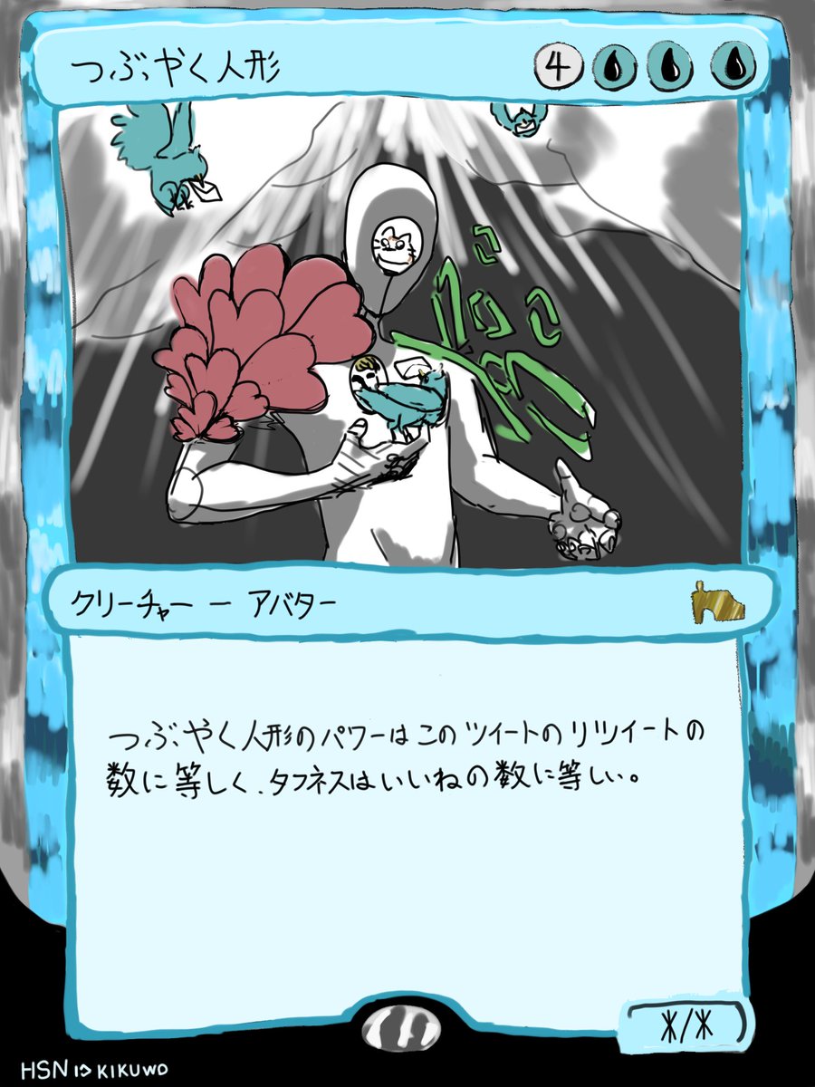 3 11 「つぶやく人形のパワーはこのツイートのリツイートの数に等しく、タフネスはいいねの数に等しい。」 身内で遊んでるオリカフォーマットでコイツを最強にして驚かせたいので協力お願いします!! #mtg #マジックザギャザリング #イラスト #オリカ 22/03/28 21:34