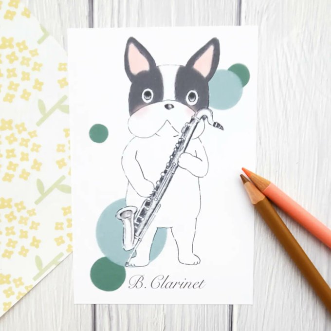 0 14 #吹奏楽 #音楽 #楽器 #色鉛筆 #イラスト #ハンドメイド 吹奏楽わんこポストカード creemaにて販売開始しました🎵 22/04/29 10:15