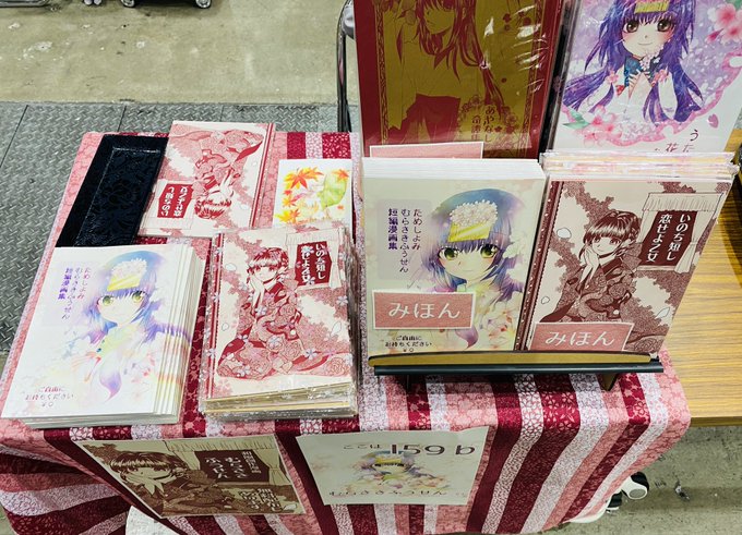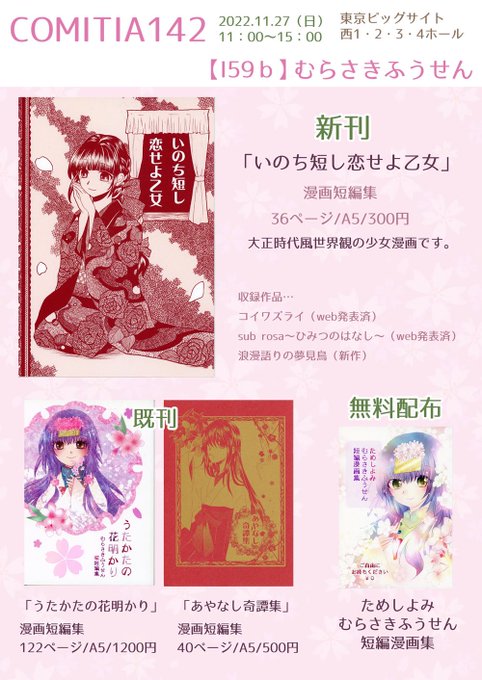#COMITIA142 #コミティア142 おしながきです。 🌸新刊「いのち短し恋せよ乙女」は短編3本を収録した漫画本です。 🌸既刊「うたかたの花明かり」「あやなし奇譚集」頒布予定です。 🌸むらさきふうせん試し読み冊子は無料配布です。こちらだけでもぜひお気軽にお持ち帰りください!