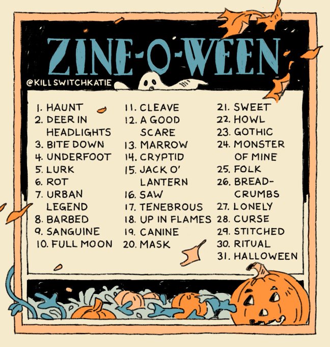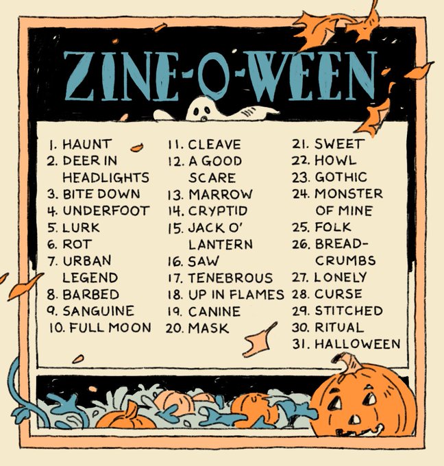 Here's the prompt challenge i'm gonna be doing next month, Zine-o-ween! Going to be drawing some things and turning them into a zine, if you'd like to join me tag your stuff #zineoween, I'd love to see it!