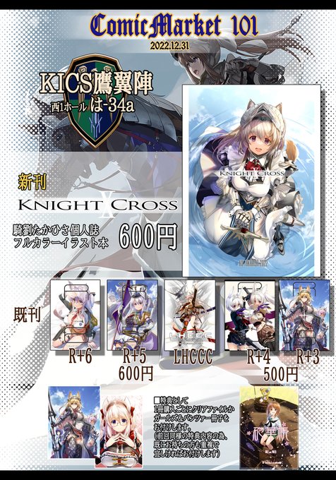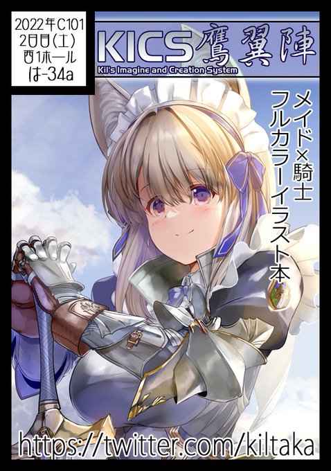 2022冬コミックマーケットのお品書きです。 KICS鷹翼陣、新刊は騎士Xメイドの融合デザインをテーマにしたフルカラーイラスト本になります。 メロンブックスでの予約も始まりましたので宜しければ是非! #C101 webcatalog-free.circle.ms/Circle/16814548 🍈melonbooks.co.jp/detail/detail.…