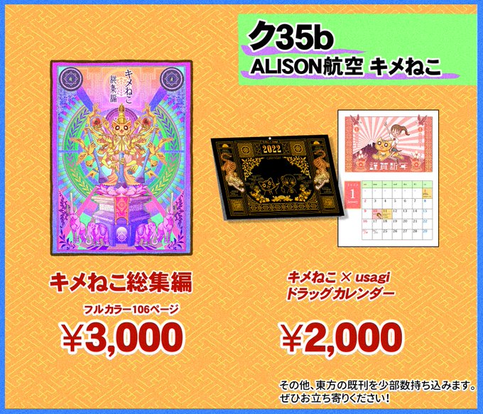 126 422 お世話になります、キメねこです。 明日(12/31)のコミケお品書きです!キメねこ総集編、usagiさんと作ったドラッグカレンダーなどを頒布いたします。通販も予定しておりますので、会場来れない方は今後の告知をお待ちください。 【ク35b】にて、どうぞよろしくお願いいたします! 21/12/30 20:11