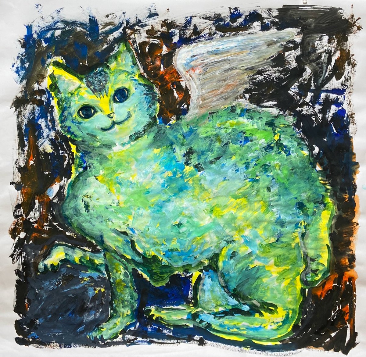 猫の絵を描くというと可愛い癒し系のイメージがある。私も猫好きとして当然それはある。 のだけど実際に模造紙に向かうと、ちょっと違う感じになるんですなんとなく。 これも翼はあるけど天使じゃない。 #猫イラスト #水彩画 #模造紙アート