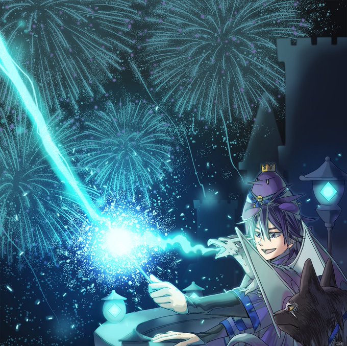 連作です🧙🐧🐶🐲 時系列はバラバラ #創作イラスト #オリジナルイラスト #イラスト #魔法使い #ペンギン #男の子 #犬 #ドラゴン #魔法 #ファンタジー #花火