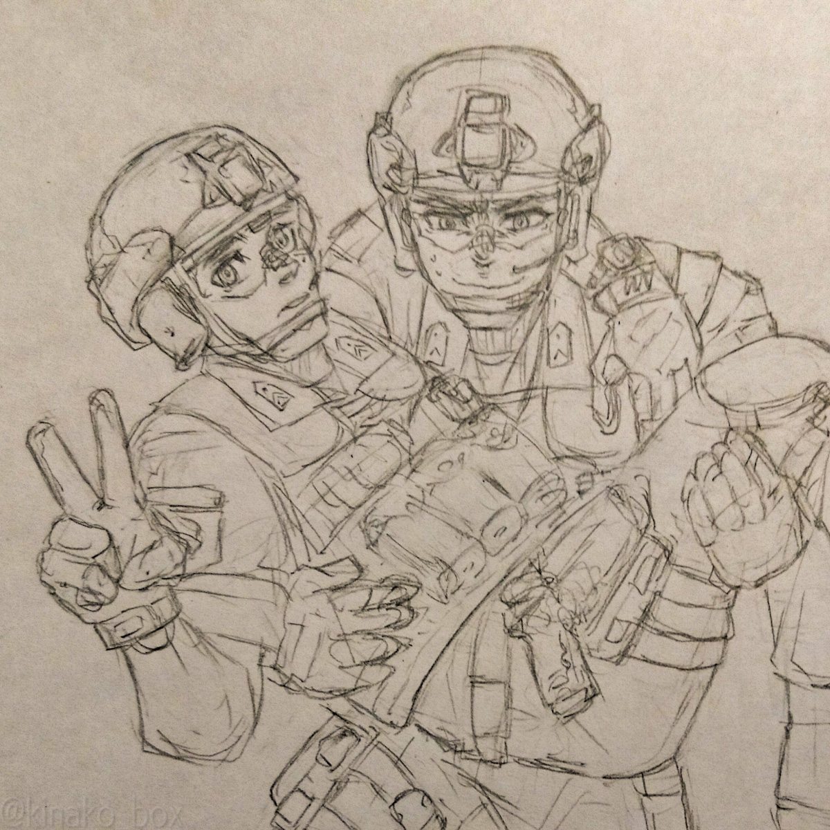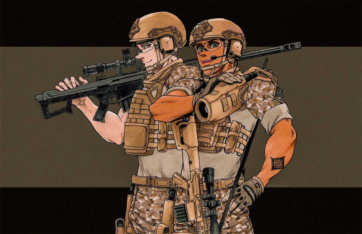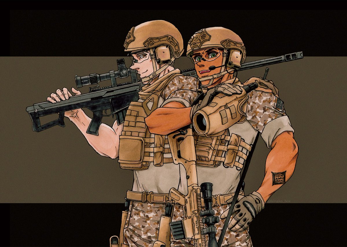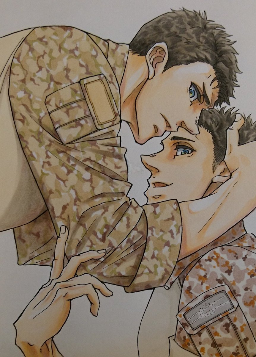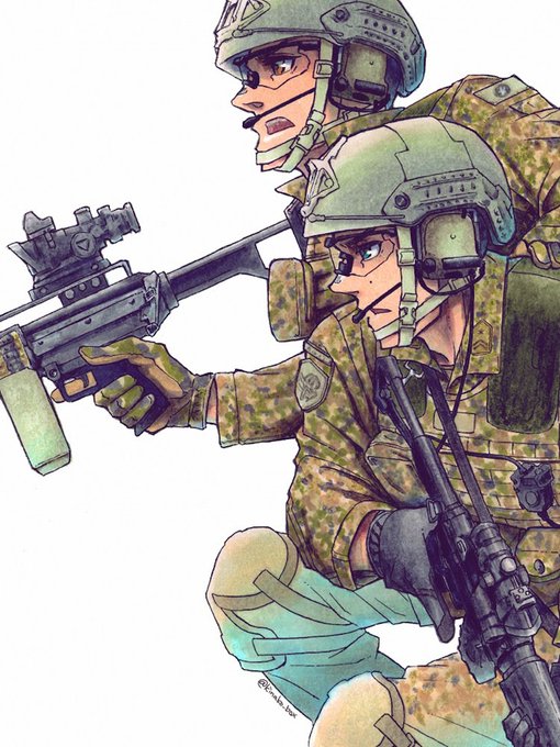 #見た人もなにか無言で2人組をあげる #コピック 1→固定ツイの創作陸自の二人(いつもの) 2→創作海兵隊狙撃手&観測手(n回目) 3→ヘッダーに入れそびれた双子(PJ弟と狙撃手兄) ~ ここまで創作BL ~ 4→エスコンZEROのFA(妄想十年後再会時空) です😀