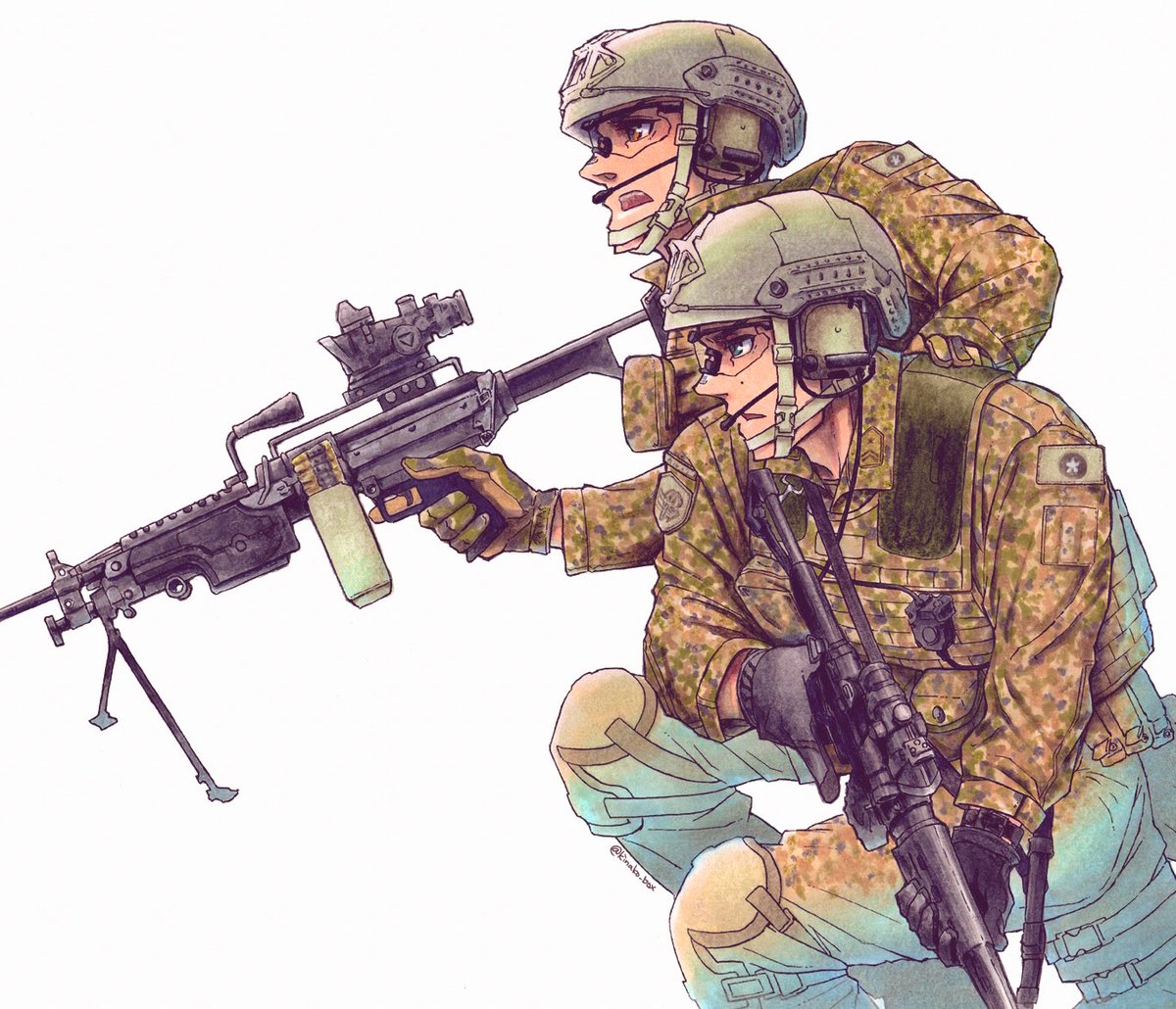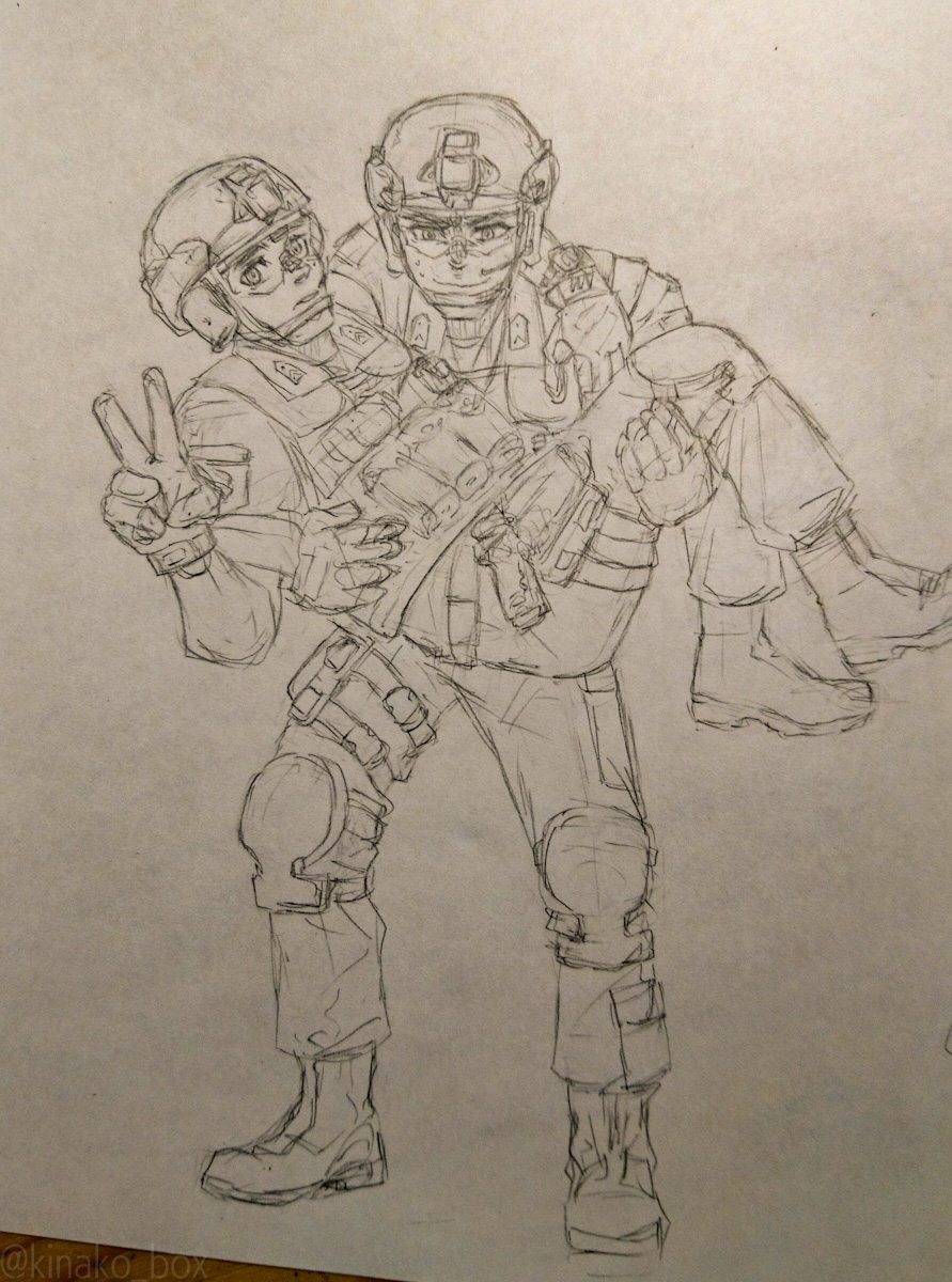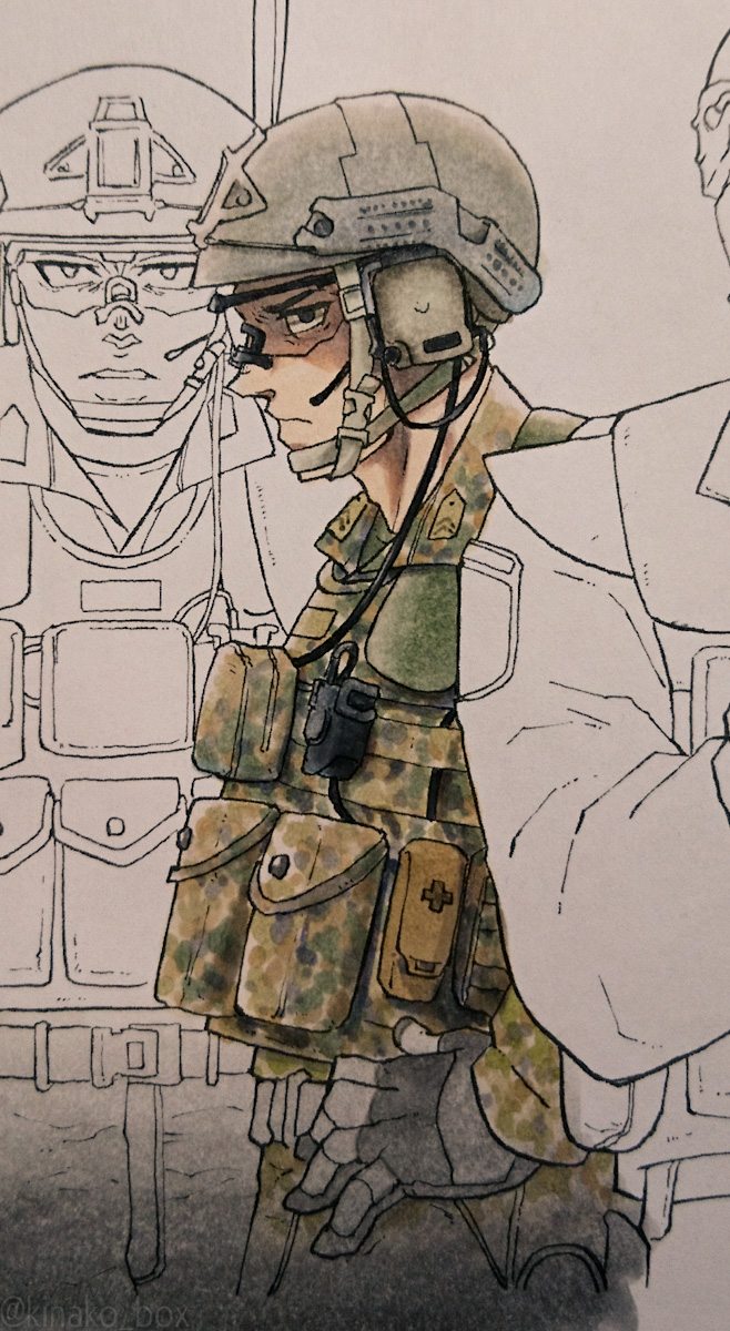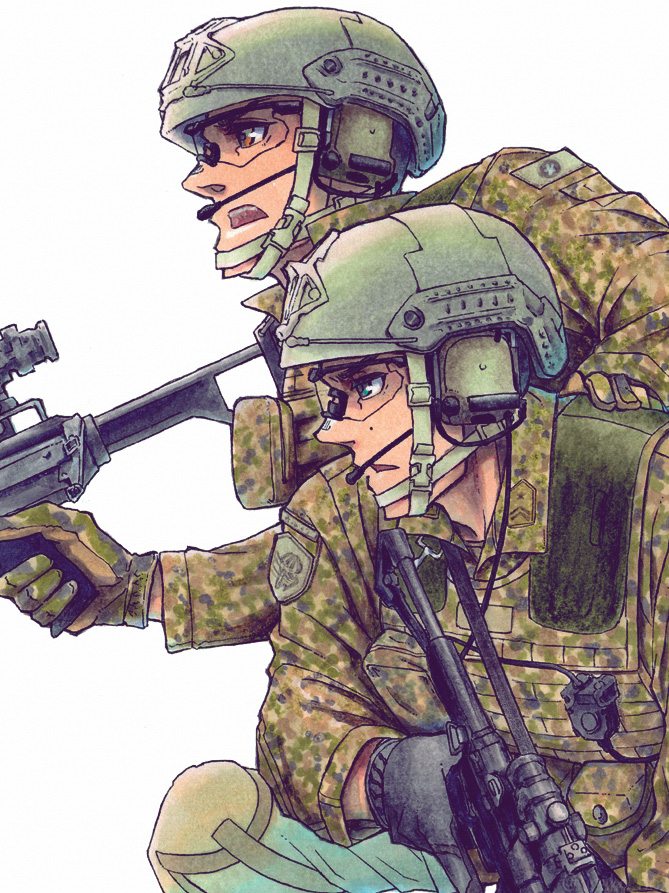 #見た人もなにか無言で2人組をあげる #コピック 1→固定ツイの創作陸自の二人(いつもの) 2→創作海兵隊狙撃手&観測手(n回目) 3→ヘッダーに入れそびれた双子(PJ弟と狙撃手兄) ~ ここまで創作BL ~ 4→エスコンZEROのFA(妄想十年後再会時空) です😀