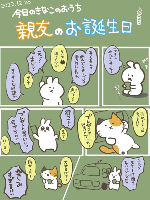 3 4 今日というか、日付変わって昨日のきなこのおうち 親友のお誕生日を知った2人は… #イラスト #漫画が読めるハッシュタグ #日常 #絵日記 22/12/21 00:32