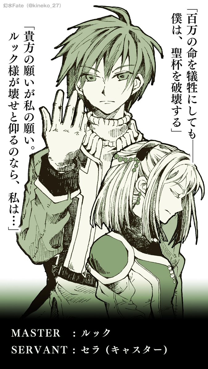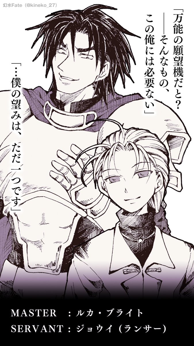 昨夜TLがFateパロ幻水だったので、個人的に見たい聖杯戦争を!!! 素材は過去絵です。 現代パロ(転生)っぽい気がする😊