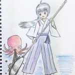 22 118 #ひいらぎ筆法帖 和清さん @KazkiyoS の柊ちゃんを久々に描かせてもらいました。 タコのブニもご一緒させてもらってます。 「絵師のお嬢さん、あっしの墨をお使いくだせぇ!」 23/07/18 21:15