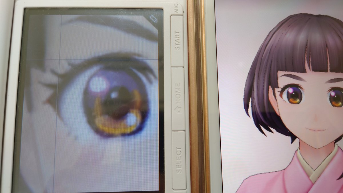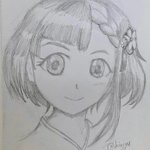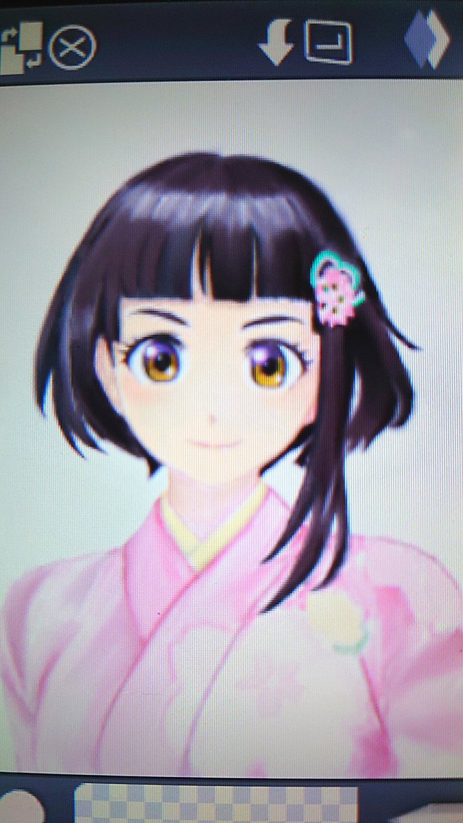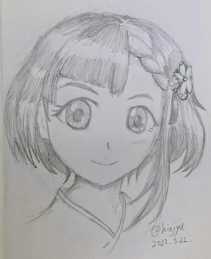 2 4 #え心 模写。しの君が、可愛すぎて、つらい!(泣)お手本と自分の描いたのと、拡大。伸びてるのはもみあげじゃない、髪飾りの裏地に黄色、目のハイライト周りに桜色、鼻の頭のハイライト、発見が多い!精進! 23/01/17 12:43