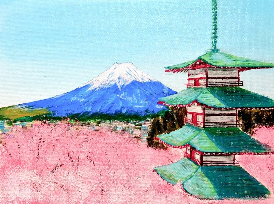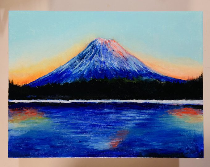 河口湖の富士山🗻 写実を捨てて、モネ風にちょっと大胆な筆と色使いで…と思って挑戦するも、結局いつも通りの写実風になってしまった😇 まあそりゃ圧倒的経験・勉強・技術 不足!けど描いてて一番楽しかった✨ #アクリル絵の具 #絵画 #絵 #絵描きさんと繫がりたい #絵描きさんとつながりたい