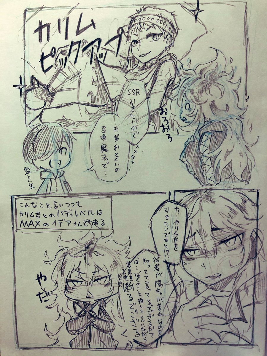 めっちゃ見にくい落書き漫画 まじでSSRが初回以外1枚も来ないのでイデア先輩に召喚魔法使って欲しい… 結局カリムくんSSRは来ませんでしたよ ※うちの子監督生の顔出てます #ツイステファンアート