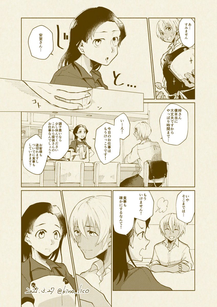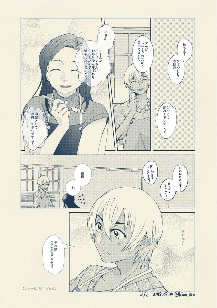 あむあず #集合ハピラッテ で展示した無配漫画。ほんとに描きたいとこだけ切り取っただけ。見ていただきありがとうございました! お互い意識しつつも共通認識で諦めてたけどうっかり動き出すやつ。2P目頭のあずさんのセリフはぜろちの描写の個人的解釈です。