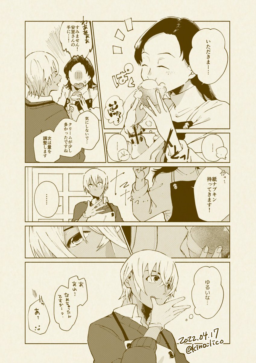 35 340 あむあず(かぼちゃ回ネタ含む) 以前リハビリ用にいただいたお題で「マリ●●ツォにかぶりつくも反対側からクリームがはみ出てしまうが気づかないあずさん」です。大変遅くなりましたがありがとうございました~! 22/04/17 22:47