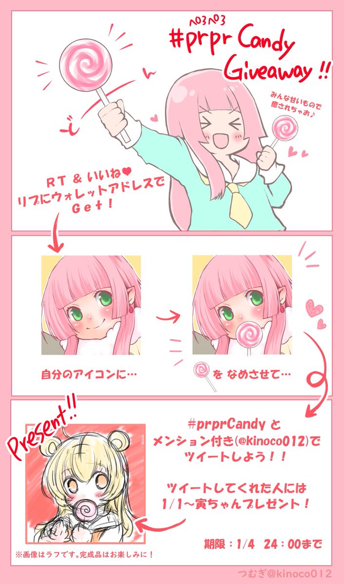 【NFT 🍭prprCandy Giveaway 】 全員に🍭をお届けします! ・このツイートをRT & 💗 ・リプ欄に ウォレットアドレス ・期限:1月4日 24:00まで 🍭を貰ったら舐めてる画像と #prprCandy @kinoco012を付けてツイート! ↓ 1月1日〜寅ちゃんイラストもプレゼント🐯 #NFTGiveaway #nftart #NFT