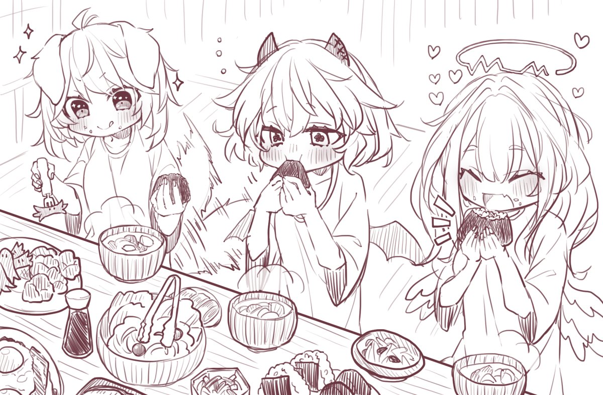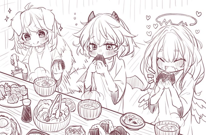 アテカテお泊り会の翌朝の朝食風景(妄想) こんなに食べないと思うけどいっぱいお食べ……という気持ち (らくがきレベルなのでタグ使って良いか悩みましたがわりと時間かけて描いたのでタグ付け……ダメでしたらご一報お願いいたします……!) #AteKateproject