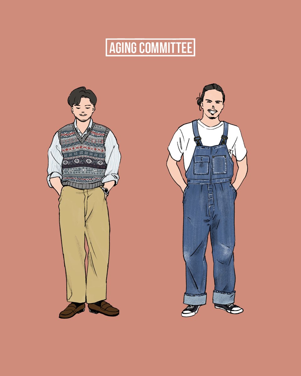 経年変化委員会さん(@J_and_LS )のコーデを描いてみました…お二人ともステキなセンスでいつも楽しくyoutubeを拝見しました😊