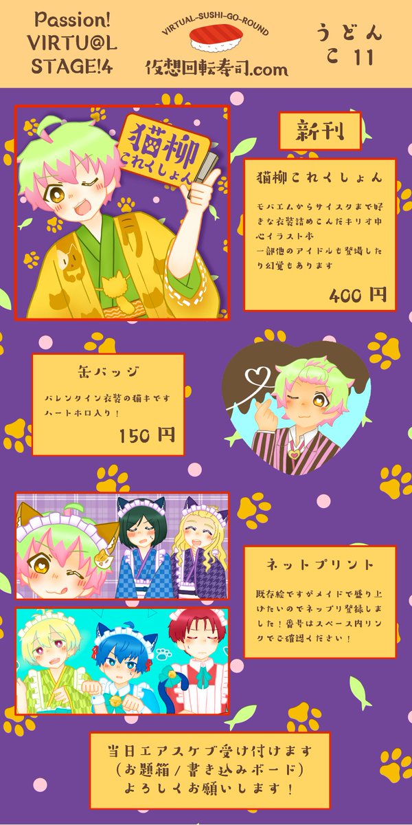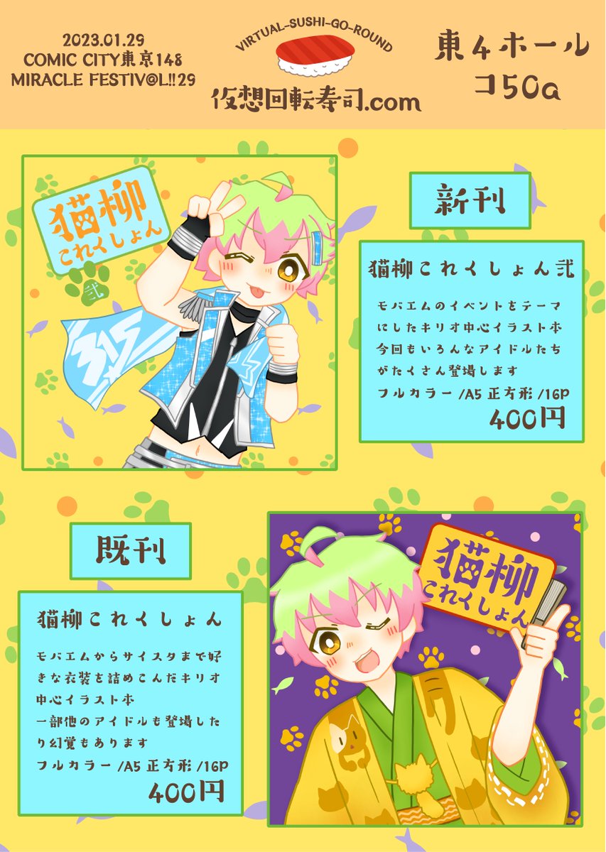 1/29 ミラフェス29 おしながきです🍣 東4ホール/コ50a【仮想回転寿司.com】 オフラインでのサークル参加はじめてです!!よろしくお願いします!!!!!! 無配でライブのときにつくった彩ポスカおいときます🌸 新刊サンプル▼ twitter.com/kinooooo_ko/st…