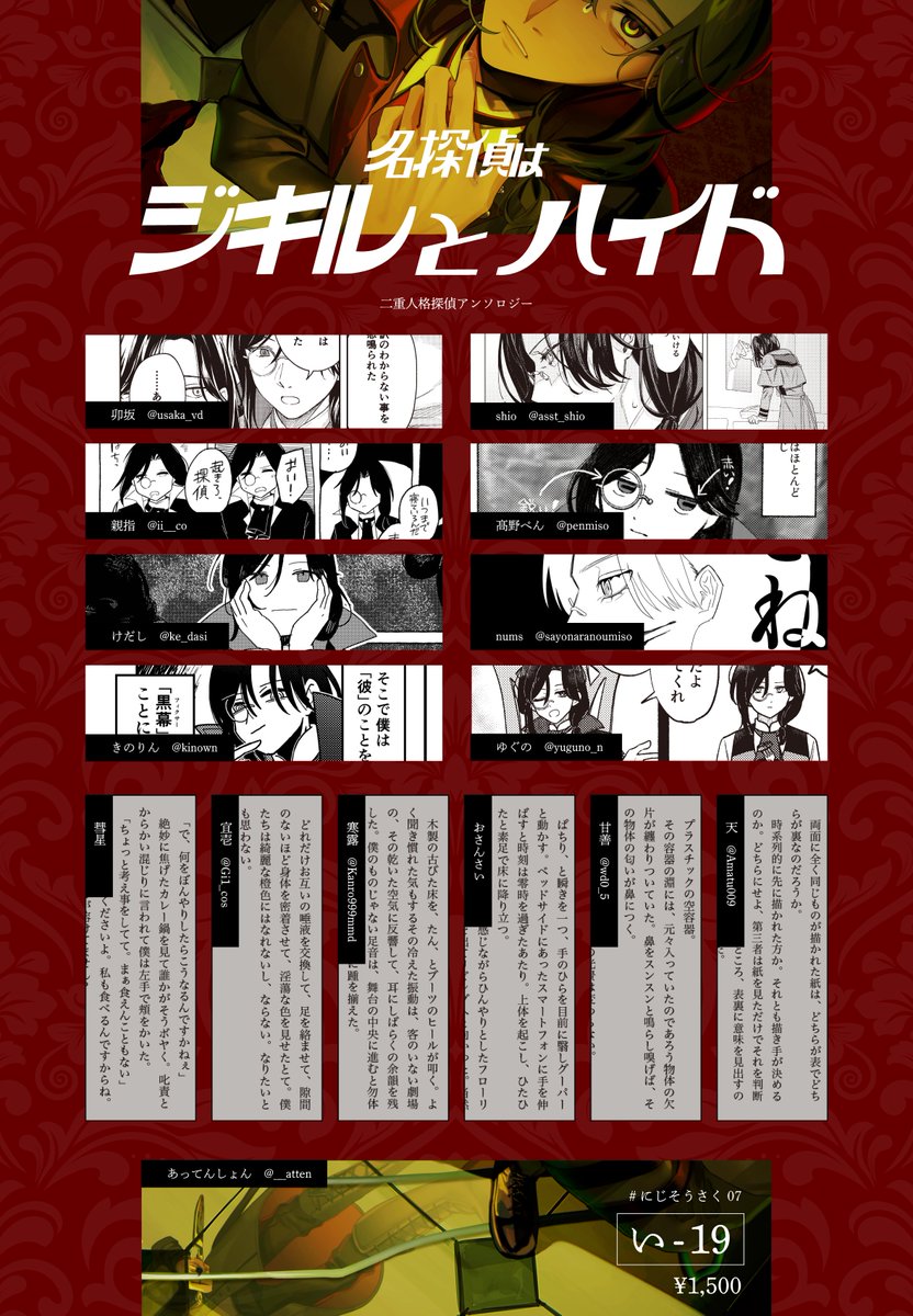 #にじそうさく07 お品書きです。アンソロジーと既刊を持っていきます。 アンソロのサンプルはこちら → #二重人格探偵アンソロジー 既刊のサンプルはこちら →pixiv.net/artworks/97876…