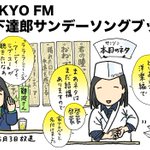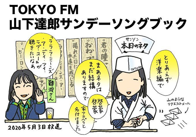 本日のサンソンは山下達郎のカバーライブ洋楽編🎤一発目「君の瞳に恋してる」から初夏の陽気にテンションも一気に✨そしてまさかの難波さんからのリクエスト笑! 来週の邦楽ネタも楽しみです🍣 #sundaysongbook #イラスト