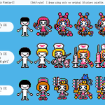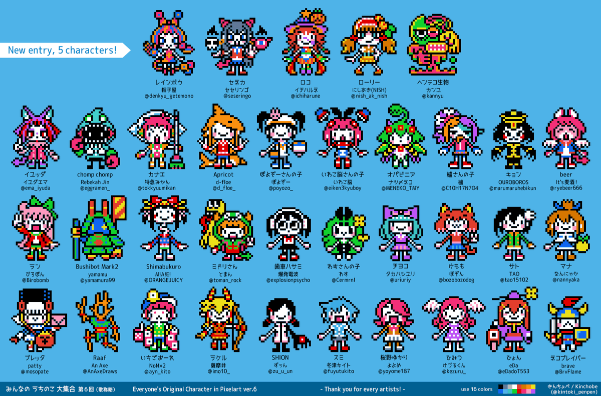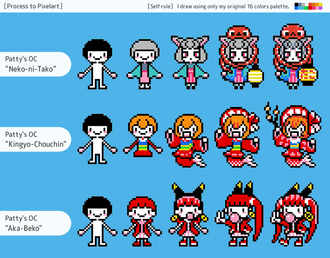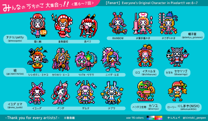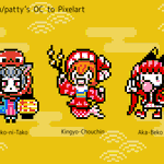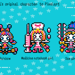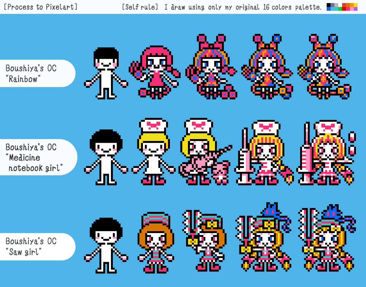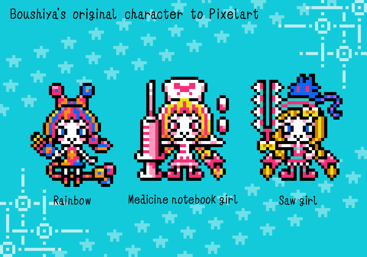帽子屋さん(@denkyu_getemono)のイラストからお気に入りの3キャラをドット絵でっ! 「RAINBOW」「お薬手帳の子」「のこぎりの子」 Boushiya's original character to pixelart! "RAINBOW", "Medicine notebook girl", "Saw girl" #fanart#pixelart#ドット絵